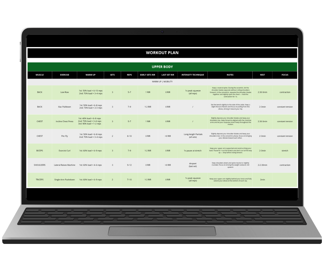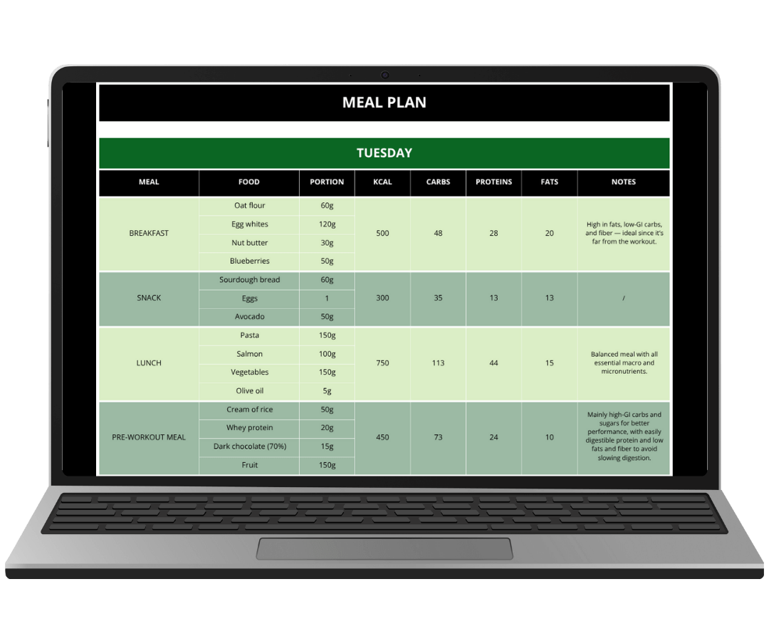 Our complete program—the most selected and loved by our clients—includes both a fully personalized workout program and a custom nutrition plan tailored to you, your goals, lifestyle, and preferences, with full 1-to-1 coaching support. Designed to complement each other, these two plans help you achieve maximum results. Detailed guidelines are included for every single aspect of both programs.